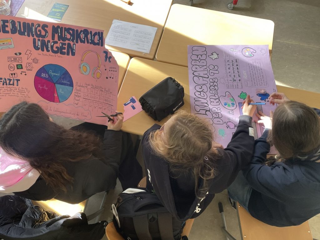 Anhand von Kreis- und Balkendiagrammen visualisieren die Siebtklässlerinnen und Siebtklässler eigene Umfragen zu Themen wie Lieblingsfarben, Lieblingsmusik und Lieblingsessen – kurz: zu ihren persönlichen Vorlieben. So verbindet die Ausstellung fachliches Arbeiten mit Daten und Diagrammen mit einer persönlichen Vorstellung der neuen Klassen. Die Schulgemeinschaft erhält damit eine anschauliche Möglichkeit, die neuen 7. Klassen über ihre Interessen und Vorlieben besser kennenzulernen und zugleich zu erleben, wie Statistik im Alltag angewandt werden kann.